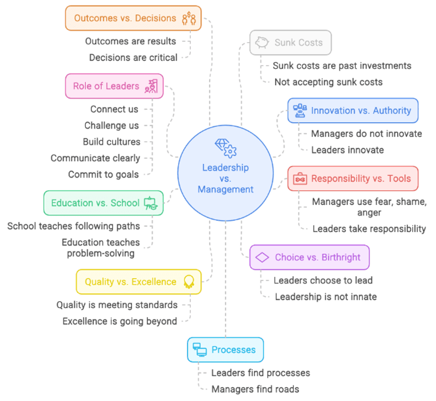 Another critical insight is the difference between decisions and outcomes. Managers often focus on outcomes—measurable results that demonstrate efficiency and effectiveness. However, leaders understand that not all outcomes are within our control. Instead, they focus on making the right decisions, knowing that these decisions, rooted in values and vision, will lead to meaningful outcomes in the long run.
