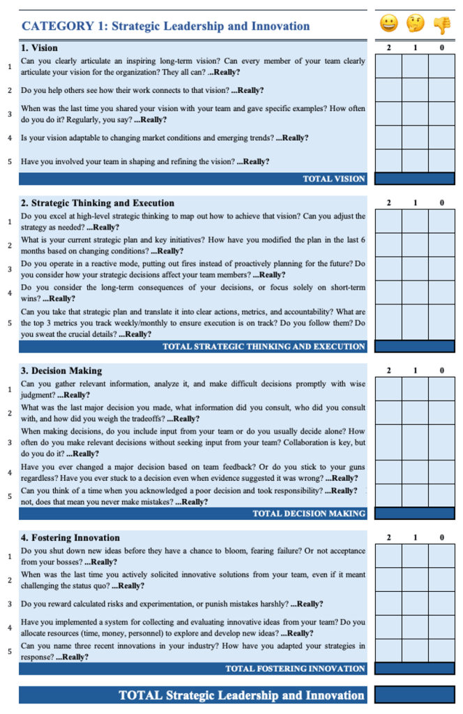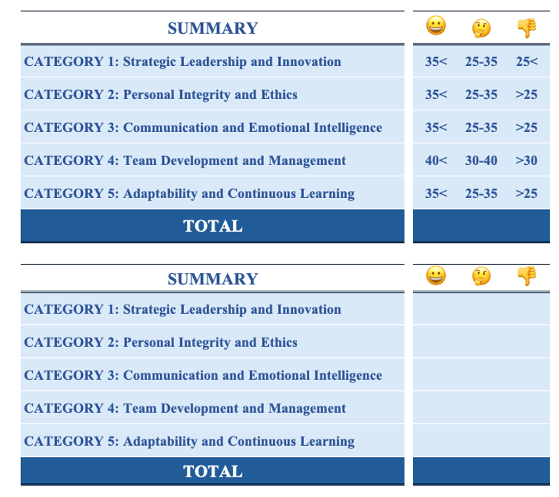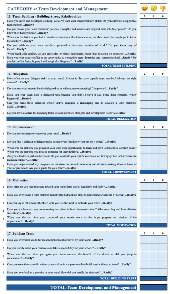 Remember, this self-assessment is a tool for growth, not judgment. Use your results to identify areas for improvement and create an action plan for your leadership development.