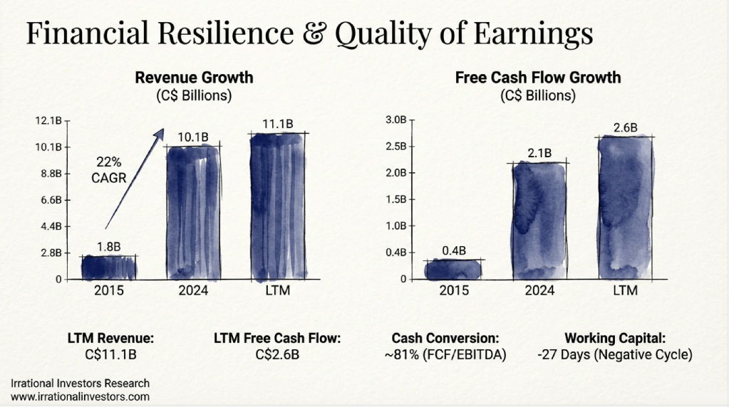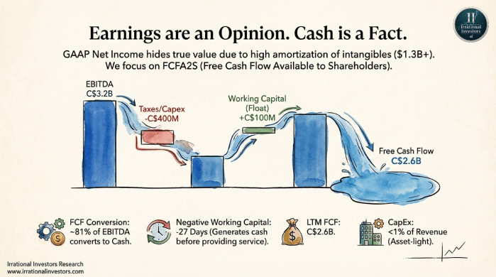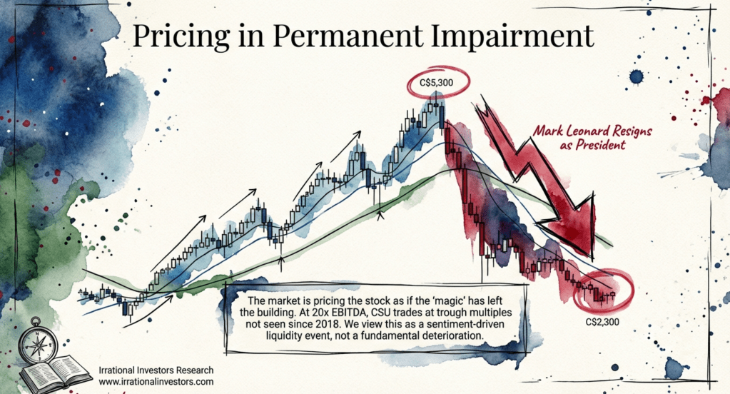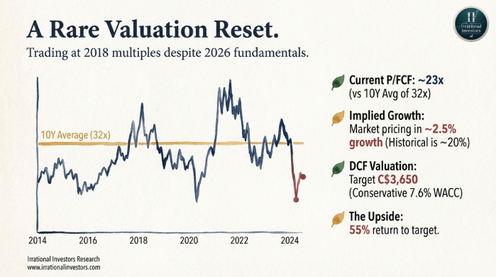 We are currently seeing a rare valuation reset. Trading at approximately C$2,357, the stock has retreated 55% from its 2025 highs, pushing its free cash flow yield to levels not seen in nearly a decade. For a company generating C$2.6 billion in LTM FCF with a fortress balance sheet (0.8x Net Debt/EBITDA), this sentiment driven drawdown could offer a compelling entry point for long-term compounders.