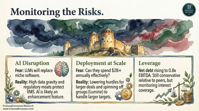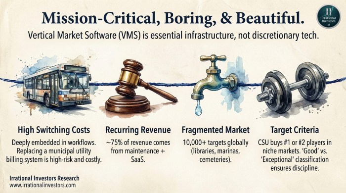 While skeptics fear AI will commoditize code, they miss the nature of Vertical Market Software (VMS). These systems aren’t just tools, they are the mission-critical backbones of hospitals, utilities, and transit networks where switching costs are astronomical and data gravity is absolute. By adopting a disciplined «fast follower» approach, Constellation is integrating AI tools like «Smart Edit» to enhance customer value, proving that domain expertise remains the ultimate moat in the LLM era.