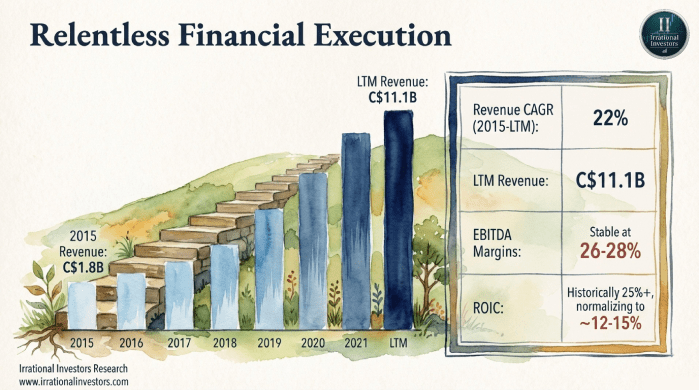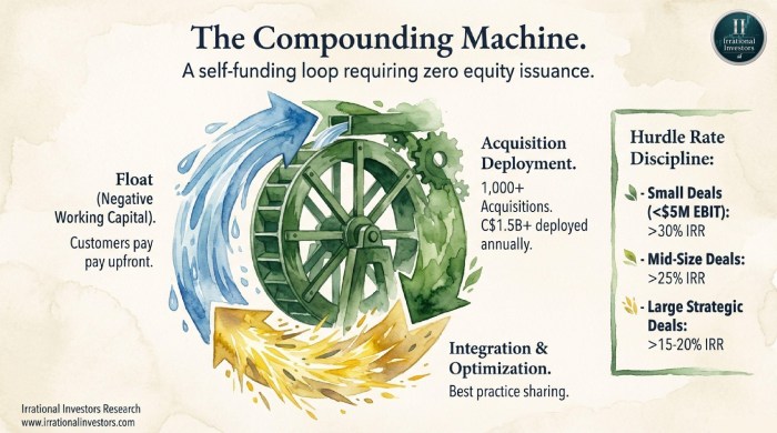The financial engine remains a masterclass in efficiency. Over the past decade, revenue has compounded at a 22% CAGR, fueled by an acquisition flywheel that targets thousands of fragmented niche providers globally. Because CSU utilizes a negative cash conversion cycle, effectively collecting maintenance fees in advance, it funds its billion-dollar M&A pipeline without diluting shareholders or relying on excessive leverage.